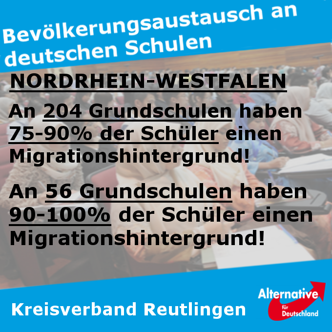 An 56 Grundschulen und an 4 Hauptschulen ist dieser "besorgniserregende" Wert bereits erreicht, an den restlichen Schulen wird bereits am "Bevölkerungsaustausch" gearbeitet, beispielsweise an den 204 Grundschulen und 31 Hauptschulen mit 75-90% Migrationsanteil...