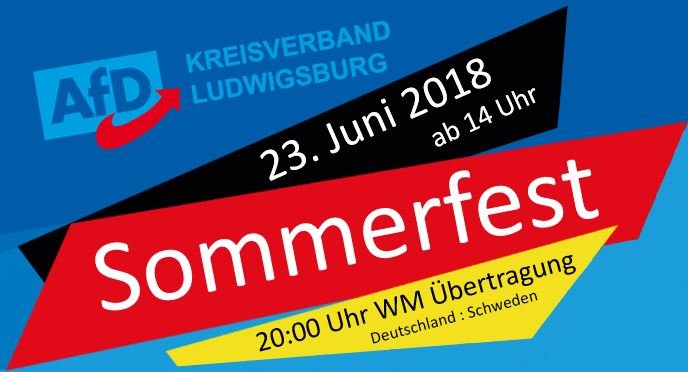 Am Samstag, 23.06.2018 fand das Sommerfest des AfD Kreisverbandes Ludwigsburg statt. Die ca. 120 Gäste hatten Grund zu feiern, denn die AfD wirkt! Dies macht sich auch in den aktuellen Umfragewerten bemerkbar. Diese stiegen seit der Bundestagswahl um 4 Prozentpunkt auf nun 16 %.