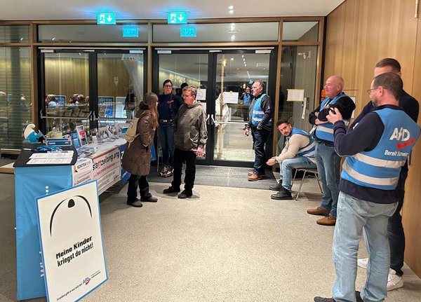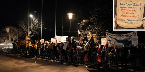 …Störungsversuche konnten nicht ausgeschlossen werden: Die zivilen Fußtruppen der Bundesregierung („Antifa“, „Omas gegen rechts“) protestierten gegen die Abhaltung einer Friedenskonferenz. Es gab auch eine kleine Gegen-Gegen-Demo, die einen sinnigen Einwand artikulierte (im Bild oben rechts).