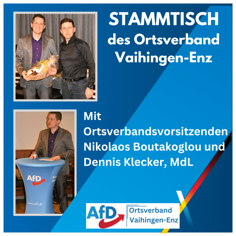 Am Dienstag, den 25.02.2025 fand der Stammtisch des AfD Ortsverbandes Vaihingen- Enz u. Umgebung statt. Thema an diesem Abend war die Landwirtschaft zwischen Bürokratie- Wahnsinn, Verbotspolitik und EU- Konkurrenz. Dazu hat der Ortsverbandsvorsitzende Nikolaos Boutakoglou den Landtagsabgeordneten Dennis Klecker als Referent eingeladen. Wie die Landwirte beschnitten und bevormundet werden, wurde von ihm ganz deutlich benannt, was die rund 40 Gäste teilweise fassungslos aufnahmen.