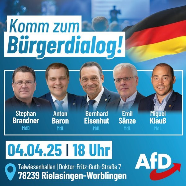 Großaufgebot im Nachbar-Landkreis: Stephan Brandner, Anton Baron, Bernhard Eisenhut, Emil Sänze und Miguel Klauß kommen zum AfD-Bürgerdialog am 4. April um 18 Uhr in die Talwiesenhallen nach Rielasingen-Worblingen, Doktor-Fritz-Guth-Straße 7. Eine gute Gelegenheit, gleich mehrere Bundes- und Landtagsabgeordnete auf einmal persönlich kennenzulernen.