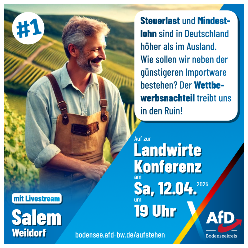 Am Donnerstag, den 19. März 2026 um 18 Uhr ist wieder der AfD-Stammtisch Ost in Kressbronn. Wir freuen uns auf bekannte und neue Gesichter! Details bitte per E-Mail erfragen.