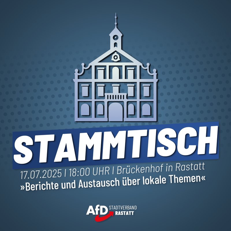 Der Stadtverband Rastatt der Alternative für Deutschland (AfD) lädt am Donnerstag, den 17. Juli 2025, um 18.00 Uhr alle interessierten Bürger zu seinem Monatstreffen in das Hotel Brückenhof in Rastatt ein. Wir werden über aktuelle Themen diskutieren und freuen uns über rege Teilnahme.
