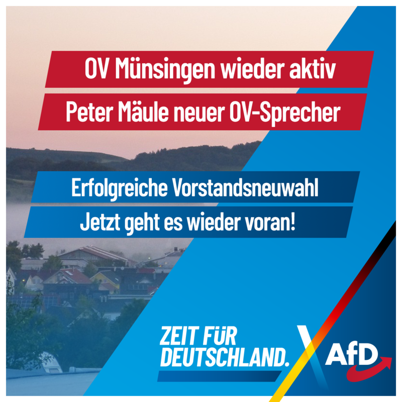 Am 30. Juli 2025 hat der Ortsverband Münsingen des AfD-Kreisverbands Reutlingen erfolgreich einen neuen Vorstand gewählt. Zum Sprecher des Ortsverbands wurde Peter Mäule gewählt.