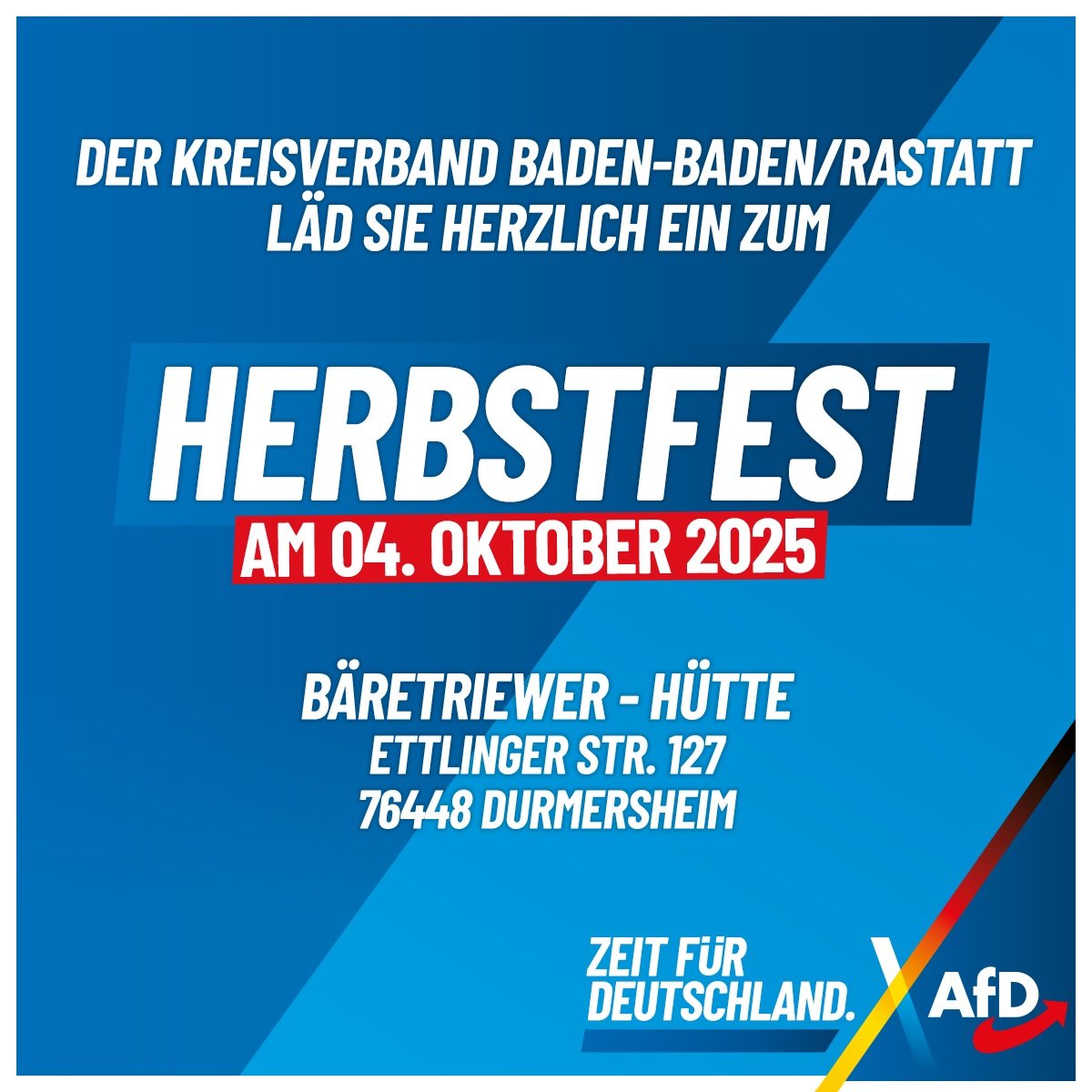 Wir laden Sie herzlich zum Herbstfest des AfD-Kreisverbands Baden-Baden/Rastatt, am 04. Oktober 2025 in der Bäretriewer-Hütte in Durmersheim ein.