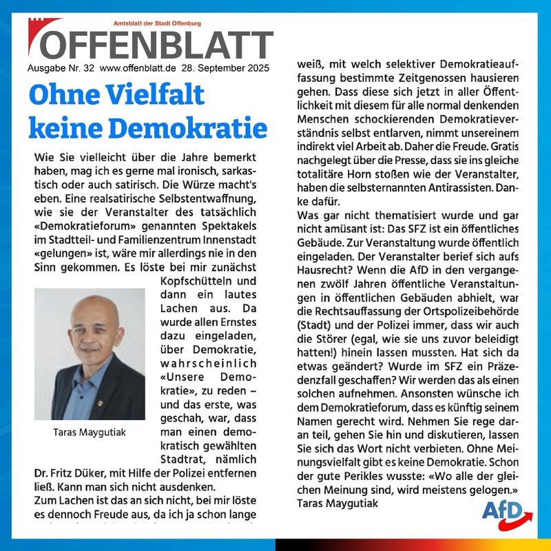Wie Sie vielleicht über die Jahre bemerkt haben, mag ich es gerne mal ironisch, sarkastisch oder auch satirisch. Die Würze macht's eben. Eine realsatirische Selbstentwaffnung wie sie der Veranstalter des tatsächlich "Demokratieforum" genannten Spektakels im Stadtteil- und Familienzentrum Innenstadt "gelungen" ist, wäre mir allerdings nie in den Sinn gekommen. Es löste bei mir zunächst Kopfschütteln und dann ein lautes Lachen aus. Da wurde allen Ernstes dazu eingeladen, über Demokratie, wahrscheinlich "Unsere Demokratie", zu reden und das Erste, was geschah war, dass man einen demokratisch gewählten Stadtrat, nämlich Dr. Fritz Düker, mit Hilfe der Polizei entfernen ließ. Kann man sich nicht ausdenken. Zum Lachen ist das an sich nicht, bei mir löste es dennoch Freude aus, da ich ja schon lange weiß, mit welch selektiver Demokratieauffassung bestimmte Zeitgenossen hausieren gehen. Und dass diese sich jetzt in aller Öffentlichkeit mit diesem für alle normal denkenden Menschen schockierenden Demokratieverständnis selbst entlarven, nimmt unsereinem natürlich indirekt viel Arbeit ab. Daher die Freude. Gratis nachgelegt über die Presse, dass sie ins gleiche totalitäre Horn stoßen wie der Veranstalter, haben die selbsternannten Antirassisten. Danke dafür. Was gar nicht thematisiert wurde und gar nicht amüsant ist: Das Stadtteil- und Familienzentrum ist ein öffentliches Gebäude. Zur Veranstaltung wurde öffentlich eingeladen. Der Veranstalter berief sich aufs Hausrecht? Wenn die AfD in den vergangenen zwölf Jahren öffentliche Veranstaltungen in öffentlichen Gebäuden abhielt, war die Rechtsauffassung der Ortspolizeibehörde (Stadt) und der Polizei immer, dass wir auch die Störer (egal wie sie uns zuvor beleidigt hatten!) hinein lassen mussten. Hat sich da etwas geändert? Wurde im Stadtteil- und Familienzentrum ein Präzedenzfall geschaffen? Wir werden das auf jeden Fall als einen solchen aufnehmen. Ansonsten wünsche ich dem Demokratieforum, dass es künftig seinem Namen gerecht wird. Nehmen Sie rege daran teil, gehen Sie hin und diskutieren, lassen Sie sich das Wort nicht verbieten. Ohne Meinungsvielfalt gibt es keine Demokratie. Schon der gute Perikles wusste: "Wo alle der gleichen Meinung sind, wird meistens gelogen."