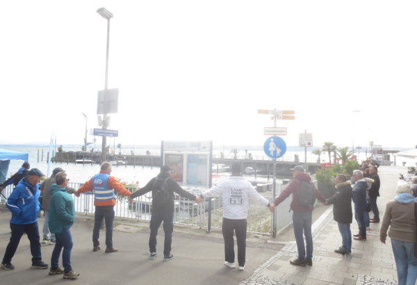 Kurz nach 15 Uhr schloss sich die Menschenkette entlang des Ufers an der Altstadt von Meersburg als Zeichen für den Frieden. Laut ertönte unser Anliegen, sich der gegenwärtigen Kriegstreiberei entgegenzustellen, und unsere Forderung: