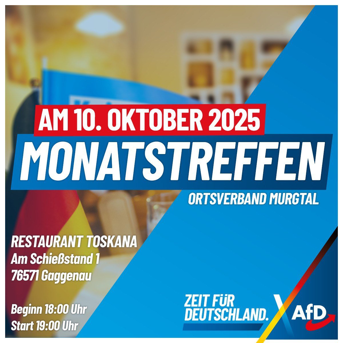 Wir laden Sie herzlich zum Stammtisch unseres Ortsverbands Murgtal ein. Der Stammtisch wird am Freitag, den 10. Oktober 2025 ab 18:00 Uhr im Restaurant "Toskana" in Gaggenau stattfinden. Wir freuen uns auf rege Teilnahme und Diskussion.