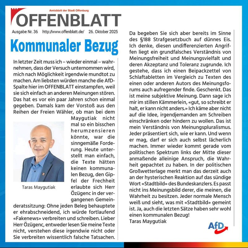 In letzter Zeit muss ich - wieder einmal - wahrnehmen, dass der Versuch unternommen wird, mich nach Möglichkeit irgendwie mundtot zu machen. Am liebsten würden manche die AfD-Spalte hier im Offenblatt einstampfen, weil sie sich einfach an anderen Meinungen stören. Das hat es vor ein paar Jahren schon einmal gegeben. Damals kam der Vorstoß aus den Reihen der Freien Wähler, ob man bei dem Maygutiak nicht mal so ein bisschen herumzensieren könnte, war die sinngemäße Forderung. Heute unterstellt man einfach, die Texte hätten keinen kommunalen Bezug, den Gipfel der Frechheit erlaubte sich Herr Özügenc in der vergangenen Gemeinderatssitzung: ohne jeden Beleg behauptete er ehrabschneidend, ich würde fortlaufend "Fakenews" verbreiten und schreiben. Lieber Herr Özügenc, entweder lesen Sie meine Texte nicht, verstehen diese irgendwie nicht oder Sie verbreiten wissentlich falsche Tatsachen. Da begeben Sie sich aber bereits im Sinne des §188 Strafgesetzbuch auf dünnes Eis. Ich denke, diesen undifferenzierten Angriffen liegt ein grundfalsches Verständnis von Meinungsfreiheit und Meinungsvielfalt und deren Akzeptanz und Toleranz zugrunde. Ich gestehe, dass ich einen Beipackzettel von Schlaftabletten im Vergleich zu Texten des einen oder anderen Autors des Meinungsforums auch aufregender finde. Geschenkt. Das ist meine subjektive Meinung. Dann sage ich mir im stillen Kämmerlein, "gut, so schreibt er halt, er kann nicht anders." Ich käme aber nicht auf die Idee, irgendjemanden am Schreiben einschränken oder hindern zu wollen. Das ist mein Verständnis von Meinungspluralismus. Jeder präsentiert sich, wie er kann. Und wenn er mag, darf er sich auch selbst lächerlich machen. Immer wieder kommt gerade vom politischen Spektrum links der Mitte dieser anmaßende alleinige Anspruch, die Wahrheit gepachtet zu haben. In der politischen Großwetterlage merkt man das derzeit auch an der hysterischen Reaktion auf das sündige Wort "Stadtbild" des Bundeskanzlers. Es passt nicht ins Meinungsbild derer, die meinen, die Wahrheit zu besitzen. Jeder normale Mensch weiß und sieht, was mit "Stadtbild" gemeint ist. Ja, auch die letzten Sätze haben sehr wohl einen kommunalen Bezug!