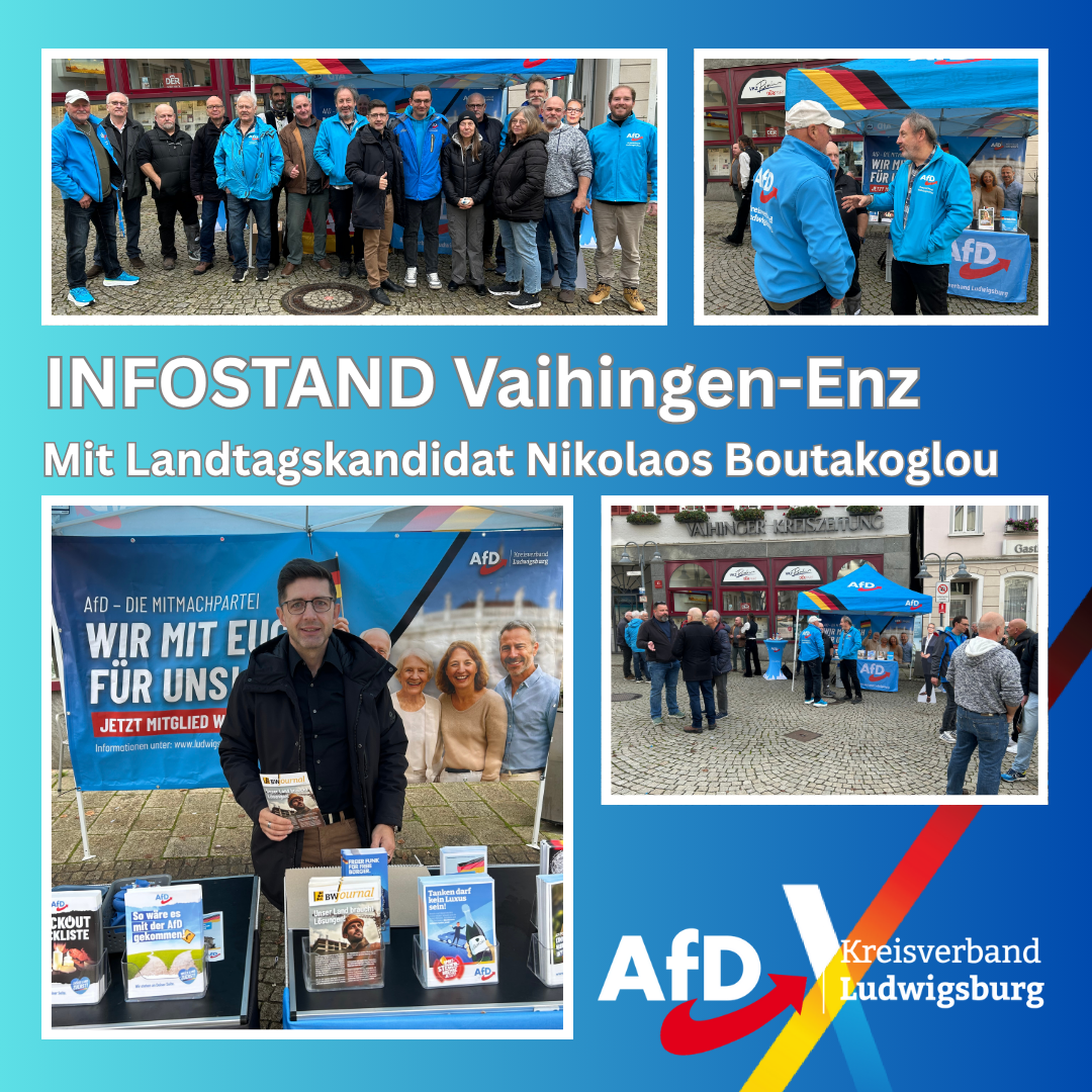 Am Samstag, 15.11.25, waren wir mit unserem Infostand auf dem wunderschönen Marktplatz in Vaihingen-Enz. Es war ein großartiger Tag mit vielen interessierten Bürgern und einer lebhaften Diskussion über die Themen, die die Menschen hier wirklich bewegen.