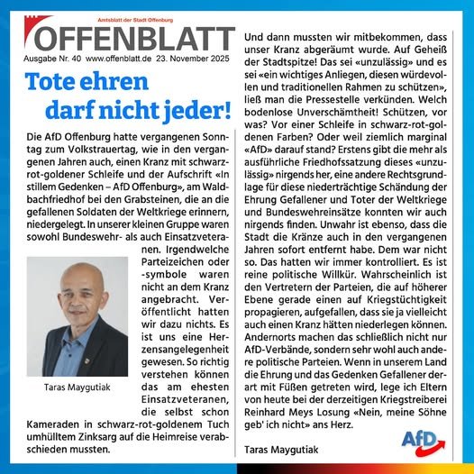 Die AfD Offenburg hatte vergangenen Sonntag zum Volkstrauertag, wie in den vergangenen Jahren auch, einen Kranz mit schwarz-rot-goldener Schleife und der Aufschrift "In stillem Gedenken - AfD Offenburg", am Waldbachfriedhof bei den Grabsteinen, die an die gefallenen Soldaten der Weltkriege erinnern, niedergelegt. In unserer kleinen Gruppe waren sowohl Bundeswehr- als auch Einsatzveteranen. Irgendwelche Parteizeichen oder -symbole waren nicht an dem Kranz angebracht. Veröffentlicht hatten wir dazu nichts. Es ist uns eine Herzensangelegenheit gewesen. So richtig verstehen, können das am ehesten Einsatzveteranen, die selbst schon Kameraden in schwarz-rot-goldenem Tuch umhülltem Zinksarg auf die Heimreise verabschieden mussten. Und dann mussten wir mitbekommen, dass unser Kranz abgeräumt wurde. Auf Geheiß der Stadtspitze! Das sei "unzulässig" und es sei "ein wichtiges Anliegen, diesen würdevollen und traditionellen Rahmen zu schützen", ließ man die Pressestelle verkünden. Welch bodenlose Unverschämtheit! Schützen, vor was? Vor einer Schleife in schwarz-rot-goldenen Farben? Oder weil ziemlich marginal "AfD" darauf stand? Erstens gibt die mehr als ausführliche Friedhofssatzung dieses "unzulässig" nirgends her, eine andere Rechtsgrundlage für diese niederträchtige Schändung der Ehrung Gefallener und Toter der Weltkriege und Bundeswehreinsätze konnten wir auch nirgends finden. Unwahr ist ebenso, dass die Stadt die Kränze auch in den vergangenen Jahren sofort entfernt habe. Dem war nicht so. Das hatten wir immer kontrolliert. Es ist reine politische Willkür. Wahrscheinlich ist den Vertretern der Parteien, die auf höherer Ebene gerade einen auf Kriegstüchtigkeit propagieren, aufgefallen, dass sie ja vielleicht auch einen Kranz hätten niederlegen können. Andernorts machen das schließlich nicht nur AfD-Verbände, sondern sehr wohl auch andere politische Parteien. Wenn in unserem Land die Ehrung und das Gedenken Gefallener derart mit Füßen getreten wird, lege ich Eltern von heute bei der derzeitigen Kriegstreiberei Reinhard Meys Losung "Nein, meine Söhne geb' ich nicht" ans Herz.