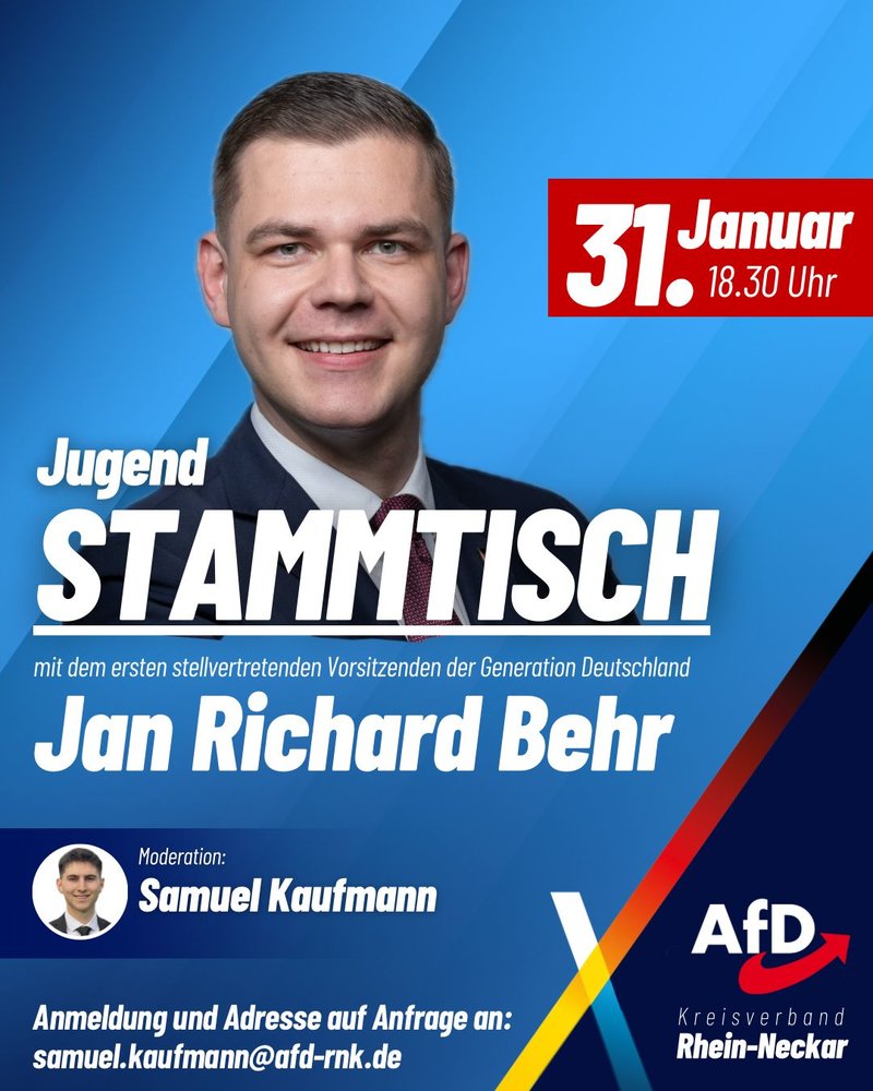 Wie ihr wisst, wurde am 29.11. in Gießen die neue Jugendorganisation der AfD, „Generation Deutschland“, gegründet. Auch der Rhein-Neckar Kreis braucht eine starke und geeinte junge Generation.