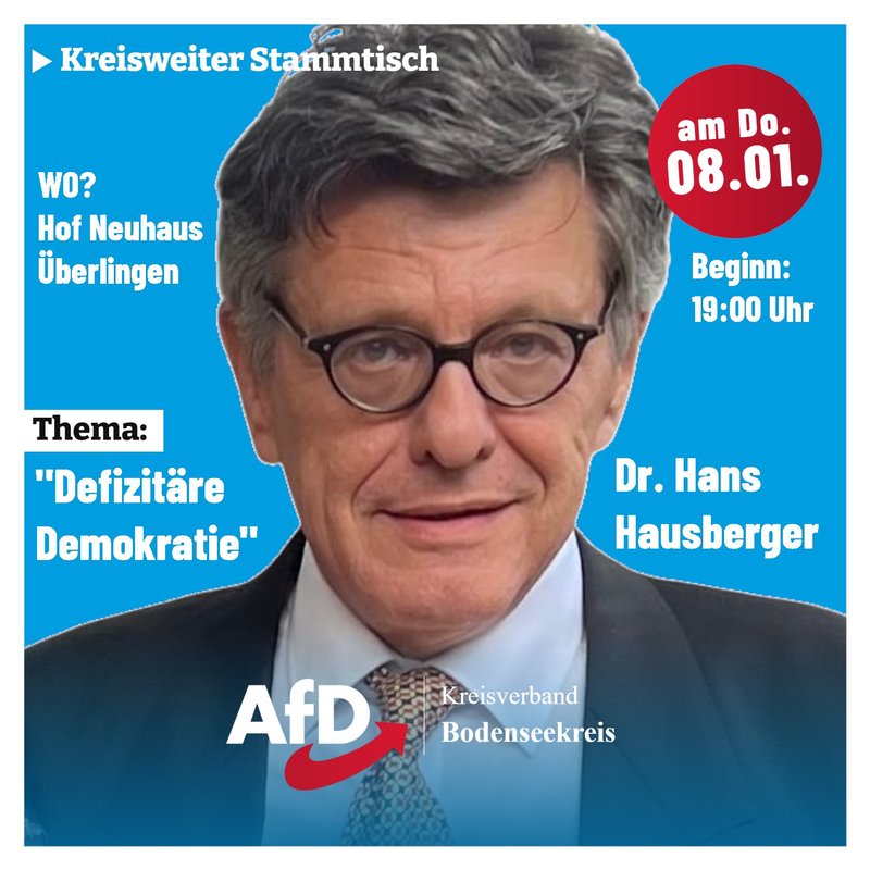 Am Donnerstag, den 19. März 2026 um 18 Uhr ist wieder der AfD-Stammtisch Ost in Kressbronn. Wir freuen uns auf bekannte und neue Gesichter! Details bitte per E-Mail erfragen.