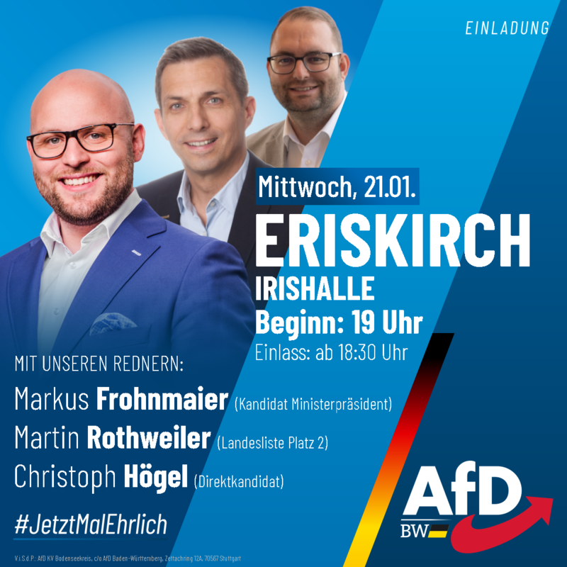Am Mittwoch, den 21. Januar 2026 um 19 Uhr lädt die AfD Bodensee herzlich ein zu unserer Wahlkampfveranstaltung in die Irishalle, Mariabrunnstraße 16, Eriskirch mit