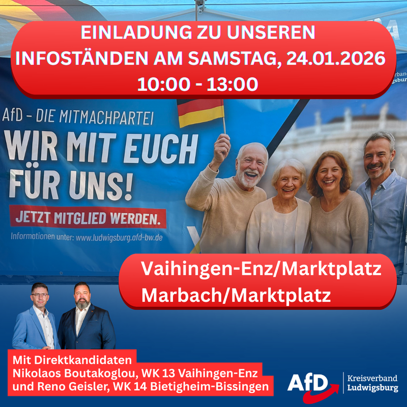 weiter geht es, wie am laufenden Band, mit den nächsten Infoständen am 24.01.2026. Bleiben wir gemeinsam am Ball, um ein super Ergebnis für unser Schwabenländle einzufahren!
