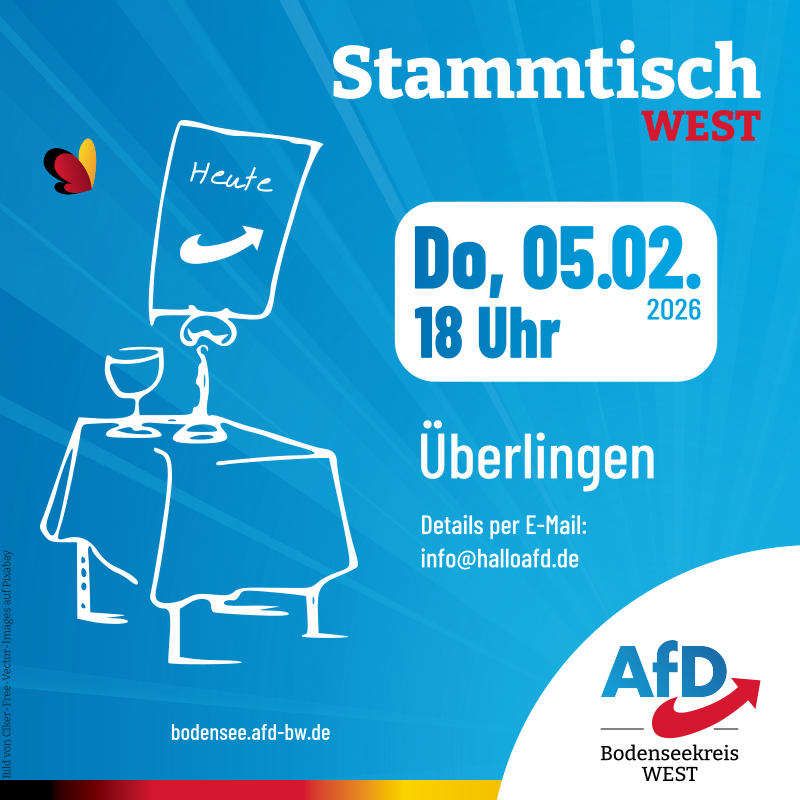 Am Donnerstag, den 5. Februar 2026 um 18 Uhr ist wieder der AfD-Stammtisch in Überlingen.