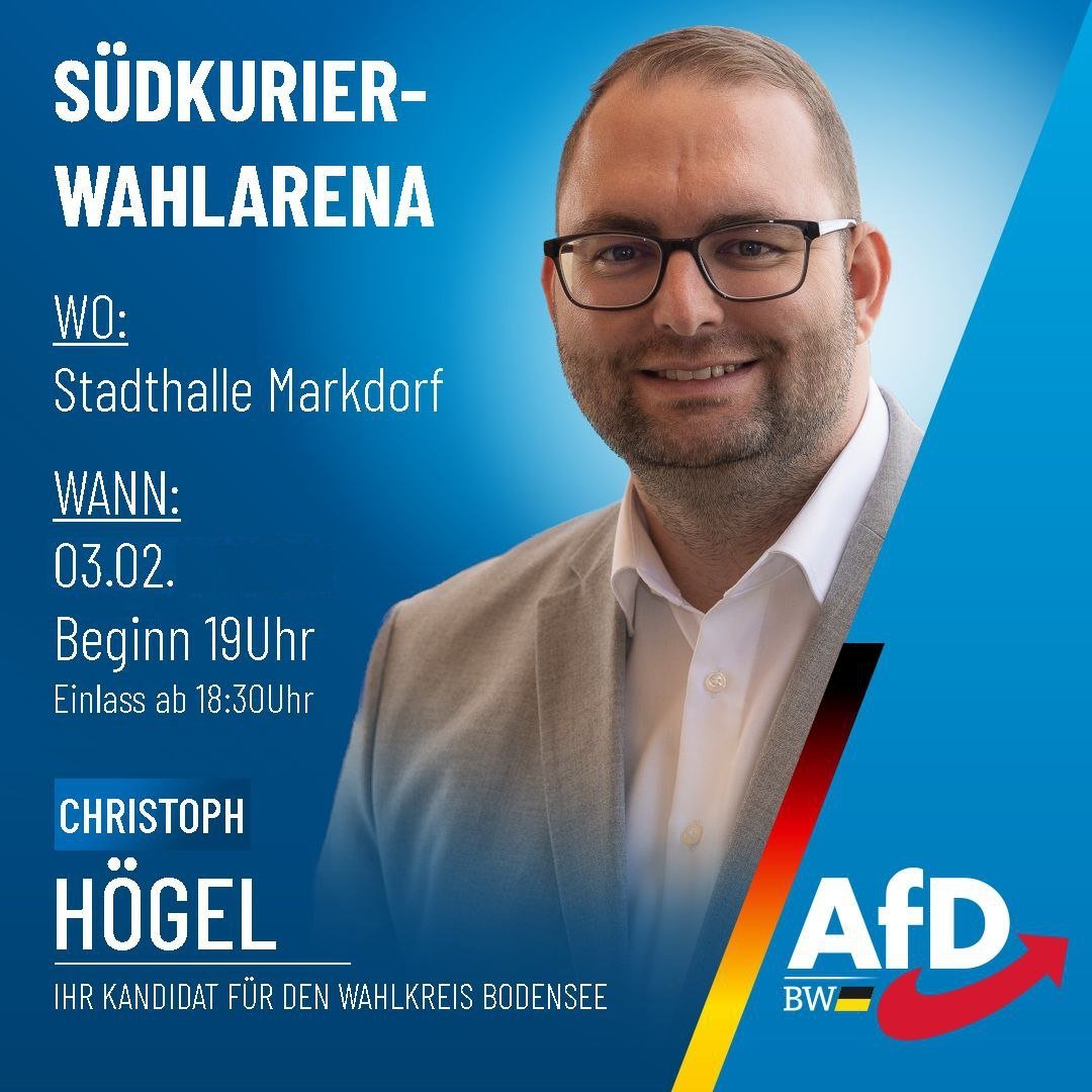 Heute, Dienstag, den 3. Februar 2026 um 19 Uhr findet in der Stadthalle Markdorf die Wahlarena statt. Die Direktkandidaten im Wahlkreis Bodensee stellen sich den Fragen der Moderation, darunter unser AfD-Direktkandidat Christoph Högel. Der Eintritt ist frei, der Einlass beginnt um 18:30 Uhr.