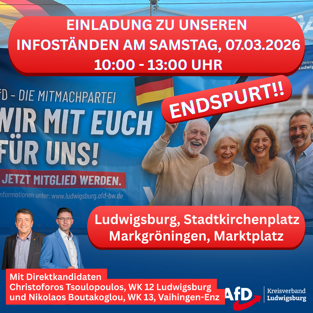 Seit dem 17.01.2026 sind wir nun jeden Samstag im Kreis Ludwigsburg mit unseren Infoständen unterwegs. Gemeinsam kämpfen wir für eine bessere Zukunft für uns alle – egal ob klein oder groß, jung oder alt. Wir danken euch ganz herzlich für eueren Einsatz und euer Durchhaltevermögen!