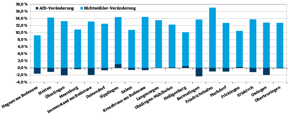 Hier geht der Glückwunsch nach Sipplingen mit dem größten Zuwachs in der AfD-Wahl (höchste "Aufwachrate", allerdings auf niedrigem Niveau). In den meisten Gemeinden schnitt die AfD dagegen leider schlechter ab. Am schlimmsten lief es in Bermatingen. Auffällig ist der stark angestiegene Anteil der Nichtwähler in allen Gemeinden um etwa 9 bis 17 Prozentpunkte.