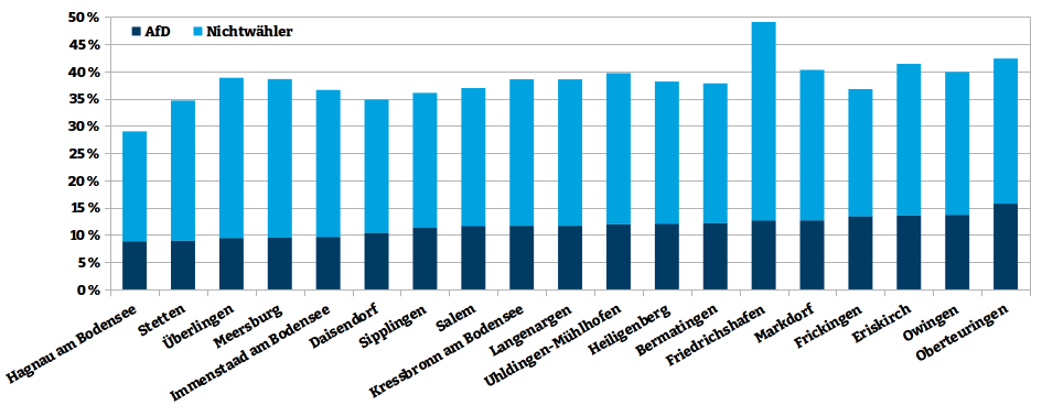 Politikverdrossenheit ist möglicherweise für viele Menschen die Vorstufe zur Wahl der AfD. Insofern könnte man die Zahl der Nichtwähler als Indikator für ein Potential betrachten, aus welchem die AfD vielleicht etwas leichter schöpfen könnte. In Überlingen und Meersburg wurde vergleichsweise wenig AfD gewählt, gleichzeitig haben in diesen beiden Städten übermäßig viele Wähler gar nicht gewählt (mehr als dreimal so viel). Auffällig hoch ist der Nichtwähleranteil auch in Friedrichshafen. Dort beträgt der Anteil der Wählerschaft, welche die AfD oder gar nicht gewählt haben, fast 50%. Das heißt, die Altparteien haben hier die Mehrheit der Wähler nicht mehr hinter sich.