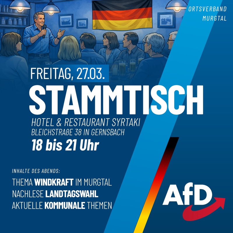 Der Ortsverband Murgtal lädt am Freitag, den 27.03.2026 zum Stammtisch im Hotel Restaurant Syrtaki in Gernsbach ein. Themen des Abends werden Windkraft im Murgtal, Nachlese zur Landtagswahl sowie kommunale Themen ein.
