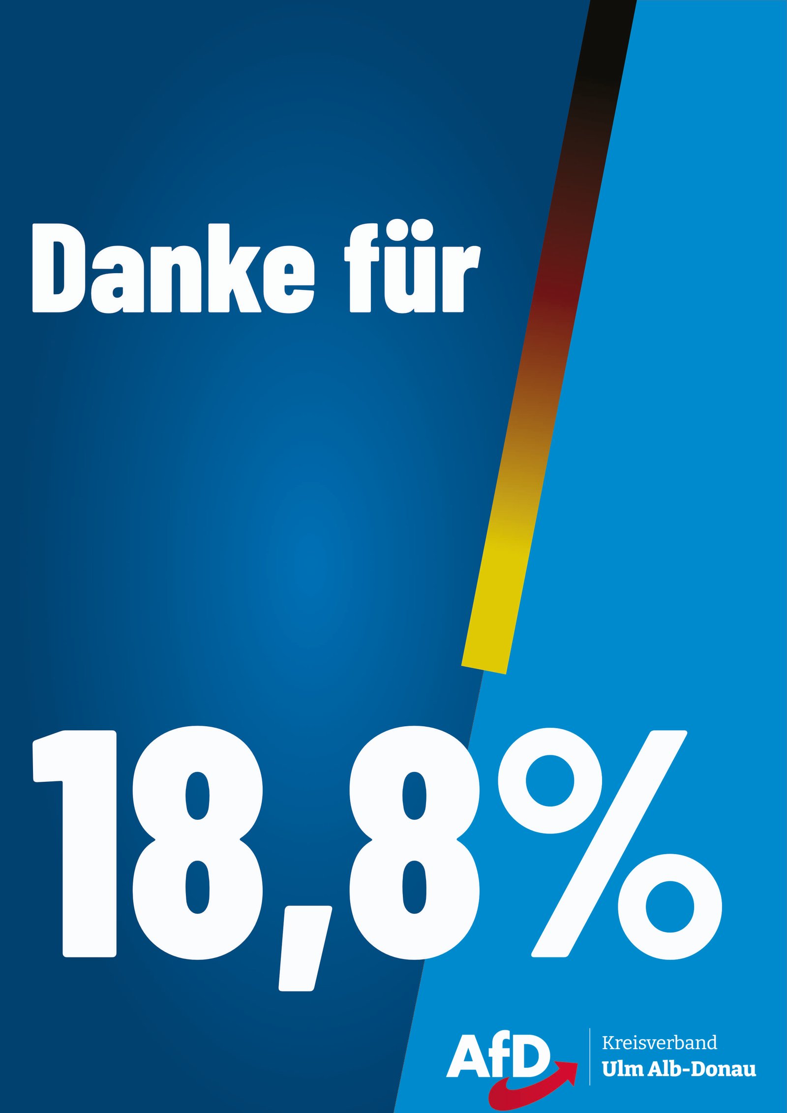 Mit 18,8% als amtliches Wahlergebnis der AfD in Baden-Württemberg haben wir unser Ergebnis von 2021 verdoppelt. Das gilt auch für unseren Kreisverband. Im Wahlkreis 64 Ulm konnte Daniel Rottmann das Ergebnis von vor 5 Jahren verdoppeln, von damals 7% auf jetzt 14,5% und auch bei den Zweitstimmen gab es eine Verdoppelung ! Im Wahlkreis 65, der den Bereich Ehingen und den weite Teile des Alb-Donau-Kreises umfasst, ist das Wahlergebnis mit 21,2% ebenfalls mehr als respektabel, zumal der Spitzenkandidat der CDU Manuel Hagel hieß. Bei den Stimmenfür den Direktkandidaten vertrauten mit 20,1% ein Fünftel der Wählerunserem Michael Scheffler. Er erzielte also Platz 2 für die AfD.