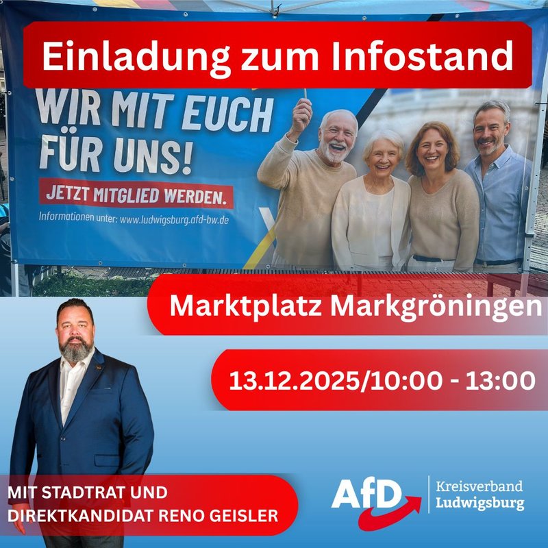 Wir laden Euch zum letzten Infostand in diesem Jahr ein: Wo: Marktplatz, 71706 Markgröningen, Finstere Gasse/Rathaus-Südseite  Wann: Samstag, 13. Dezember 2025  Uhrzeit: 10:00 – 13:00 Uhr Mit dabei: Unsere 3 Landtagskandidaten für die anstehende Wahl am 08.03.2026. Packt euch warm ein, bri...