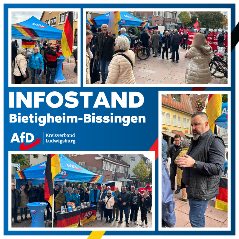 Infostand der AfD am 18.10.2025 in Bietigheim-Bissingen Am vergangenen Wochenende informierten wir Bürger bei einem Infostand in der Innenstadt über aktuelle politische Themen und die Positionen der Partei. Trotz Protestaktion der Internationalen Jugend Stuttgart verlief die Veranstaltung ruhig u...