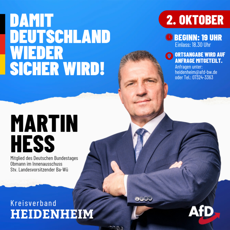“ Damit Deutschland wieder sicher wird. ” +++ Stammtisch mit Martin Hess MdB am 02.10.2025 um 19:00 Uhr +++   Wir freuen uns, am Donnerstag, den 2. Oktober 2025, den Bundestagsabgeordneten Martin Hess als Gastredner anlässlich unseres Stammtisches begrüßen zu dürfen. Martin Hess, Mitglied...