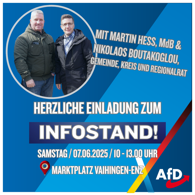 Einladung zum Infostand in Vaihingen-Enz am 07.06.2025 mit Martin Hess, MdB