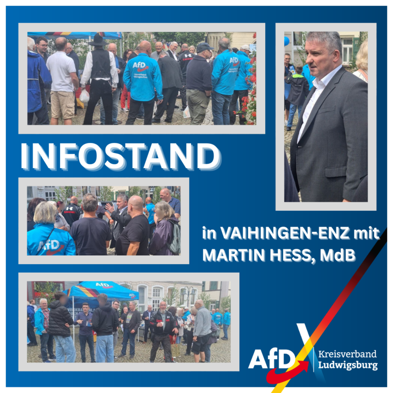 Heute traf sich der KV Ludwigsburg am Infostand in Vaihingen/Enz. Der Zuspruch war überwältigend, denn viele Bürger sind enttäuscht und fühlen sich von den Altparteien, allen voran der CDU, betrogen. Mit am Stand war unser Bundestagsabgeordneter Martin Hess, der viele Marktbesucher mit eindeut...