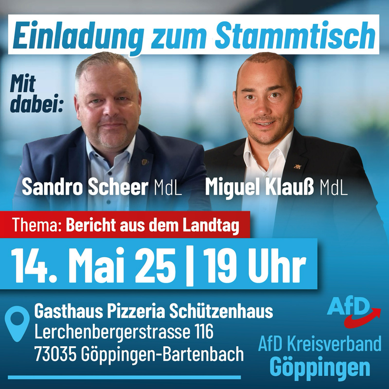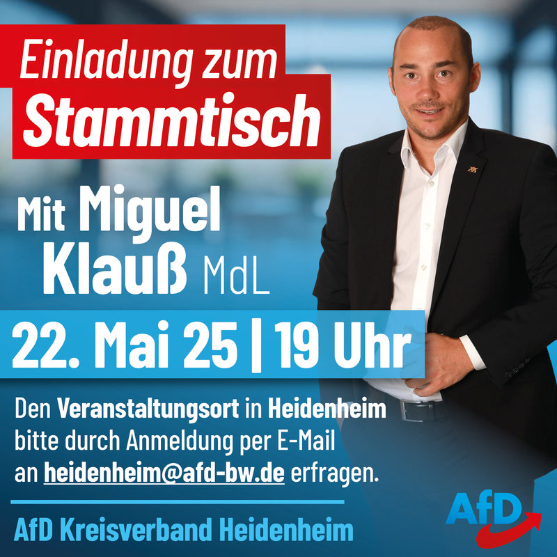 Einladung zum Stammtisch mit Miguel Klauß MdL. Der AfD Kreisverband Heidenheim lädt am 22. Mai 2025 ab 19:00 Uhr herzlich zum Stammtisch mit Miguel Klauß MdL ein.  Der Abgeordnete Miguel Klauß der AfD Fraktion im Landtag von Baden-Württemberg wird auf aktuelle Themen eingehen und Einblicke in...
