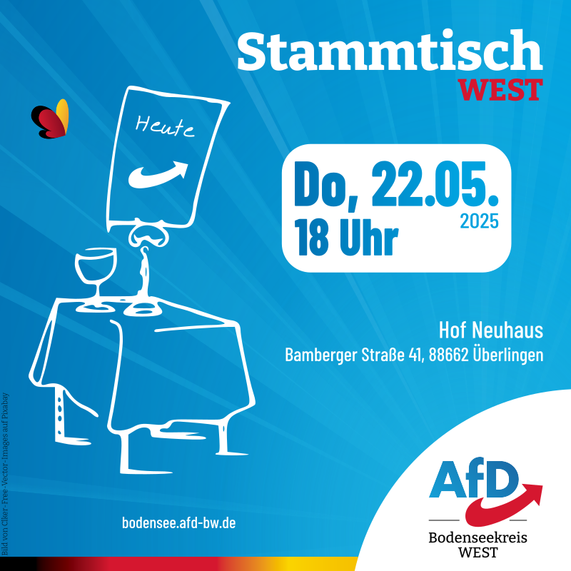 Am Donnerstag, den 22. Mai 2025 um 18 Uhr ist wieder der AfD-Stammtisch West im Hof Neuhaus. Hans Diether Roth und Thorsten Peters berichten über das Geschehen im Kreistag und Gemeinderat. Wir freuen uns auf bekannte und neue Gesichter in gemütlicher Runde!