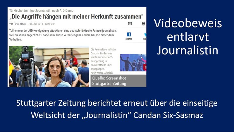 Heute titelt die Stuttgarter Zeitung: „Die Angriffe hängen mit meiner Herkunft zusammen“. Die Zeitung behauptet erneut, dass Teilnehmer der AfD Kundgebung die türkischstämmige Journalistin Candan Six-Sasmaz attackiert hätten und verbreitet ihre einseitige Weltsicht. Der Videobeweis spric...