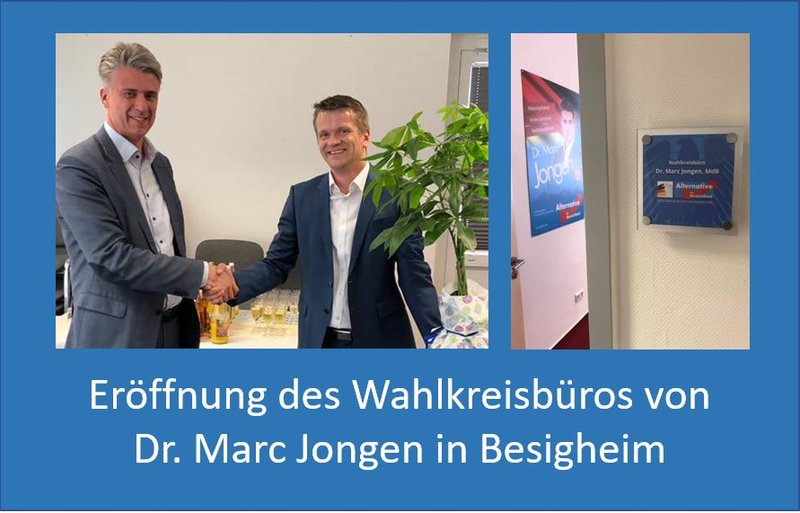 Dr. Marc Jongen hat heute in Besigheim sein neues Wahlkreisbüro eröffnet. Etwa 30 Parteifreunde aus den Kreisverbänden Ludwigsburg und Heilbronn waren gekommen, um auf das Ereignis anzustoßen. Alle interessierten Bürger im Wahlkreis Neckar-Zaber sind eingeladen mit Dr. Marc Jongen ins GesprÃ...
