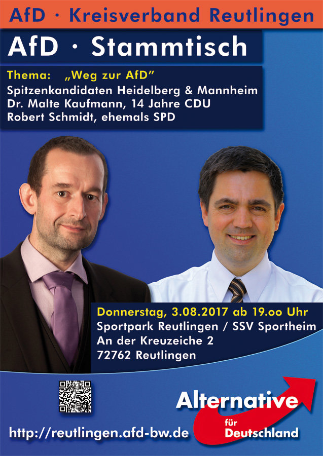 Der AfD-Kreisverband Reutlingen richtet am Donnerstag, den 3. August, im Restaurant Sportpark eine Veranstaltung aus. Referenten sind Robert Schmidt und Dr. Malte Kaufmann, die AfD-Direktkandidaten zur Bundestagswahl in Mannheim und Heidelberg. Dagegen wurde nun mutmaßlich aus dem linksextremen Umf...