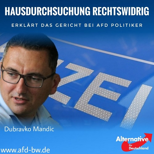 Die Zweite Große Strafkammer des Landgerichts Karlsruhe hat festgestellt, dass die bei Rechtsanwalt Dubravko Mandic in seiner Privatwohnung durchgeführte Durchsuchung unverhältnismäßig und damit rechtswidrig war. Die Polizei hatte zuvor die Privatwohnung des AfD-Mitglieds am 13. Oktober 2016 un...