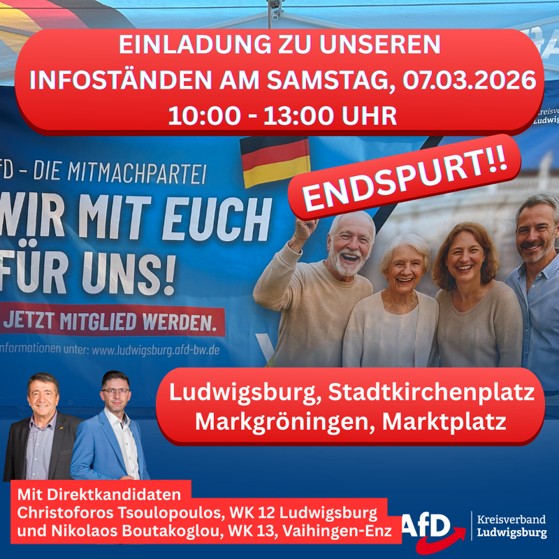 Endspurt! Letzte Infostände vor der Landtagswahl! Wir haben es fast geschafft. Der letzte Samstag vor der Wahl steht an und wir haben folgende Standplätze gebucht: Stand 1 Wann:                               07.03.2026 Wo:                      ...
